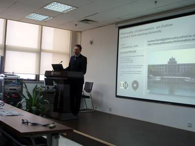 根据中国社会科学院与英国学术院(British Academy)的协议,英国著名学者,当代国际信息哲学(Philosophy of Information)的积极倡导者和创始人弗洛里迪(Luciano Floridi)教授,应邀于2008年9月21日至30日在中国进行了访问,共做了五场系列学术讲演。其中在北京进行了四场,分别在中国社科院、北京大学、中国人民大学、北京理工大学。应我校黑料网