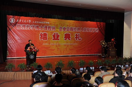各班学员代表(孟红艳、范化冬、岳美丽、陈文礼、朱兵民同学)发言,回顾了在交大期间美好的学习生活和收获,抒发了他们对交大的深厚情感和抱负,并向母校及所有帮助和支持他们的家人、授课老师、班主任、教辅人员和同窗好友表达了由衷的感谢。他们诚挚地表示,要以崇高的使命感和责任感投入今后的工作中,以出色的工作业绩回报母校。