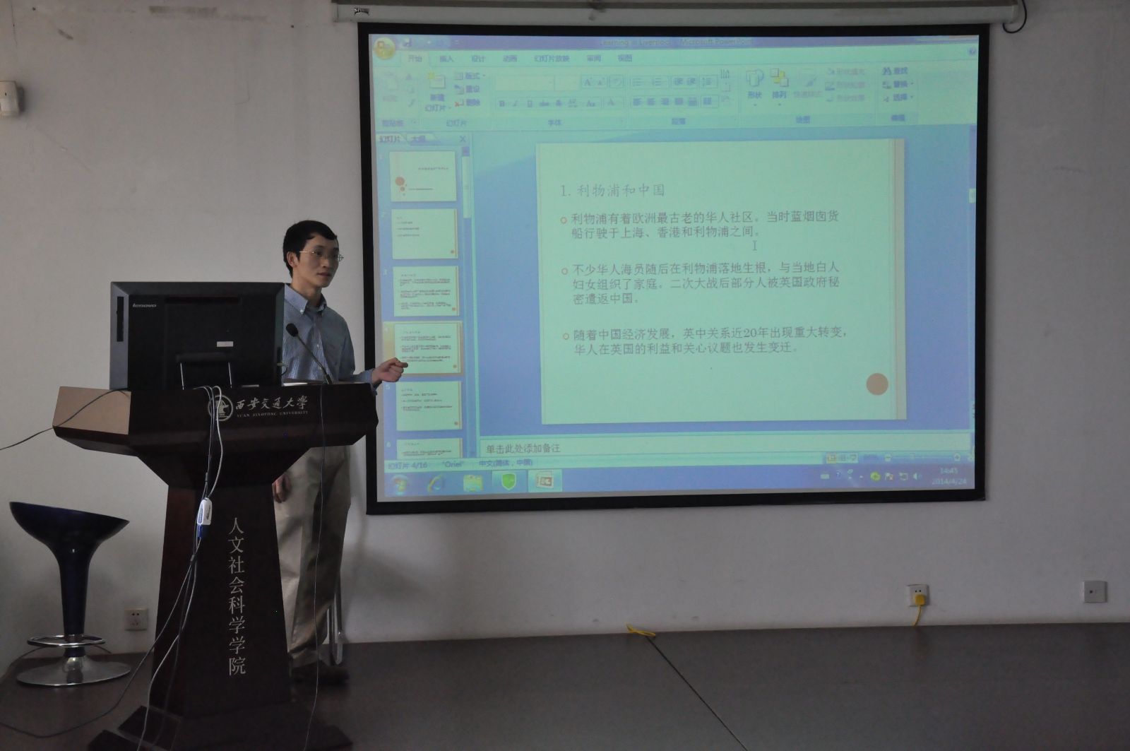 四位教师在介绍利物浦的城市印象和学习生活的基础上,也分别结合自己的专业方向和研究兴趣,分享了在利物浦大学的学习体会。社会学系卢春天老师着重介绍了利物浦大学的教学观摩,并就中英两国的本科生教育及社会学专业的课程设置进行了比较,尤其提到课后大量阅读的要求和研讨会(seminar),是促使学生主动学习的重要途径。在谈到英语学习时,卢老师认为,每周25-30个小时的强化学习使自己重新回到了紧张充实的大学时代,培训的众多知识点对将来运用到实际工作大有裨益。