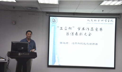 首先,李黎明副院长介绍了“三立杯”学术作品竞赛情况。此次竞赛从2014年11月拉开帷幕,到2015年5月31日评审结束,共持续了6个多月的时间。有100多名本科生和研究生提交了作品,共收到76份作品,其中集体作品13份,其余为个人作品。作品包括理论研究论文、社会调查报告、设计类作品、书法作品及文学作品。