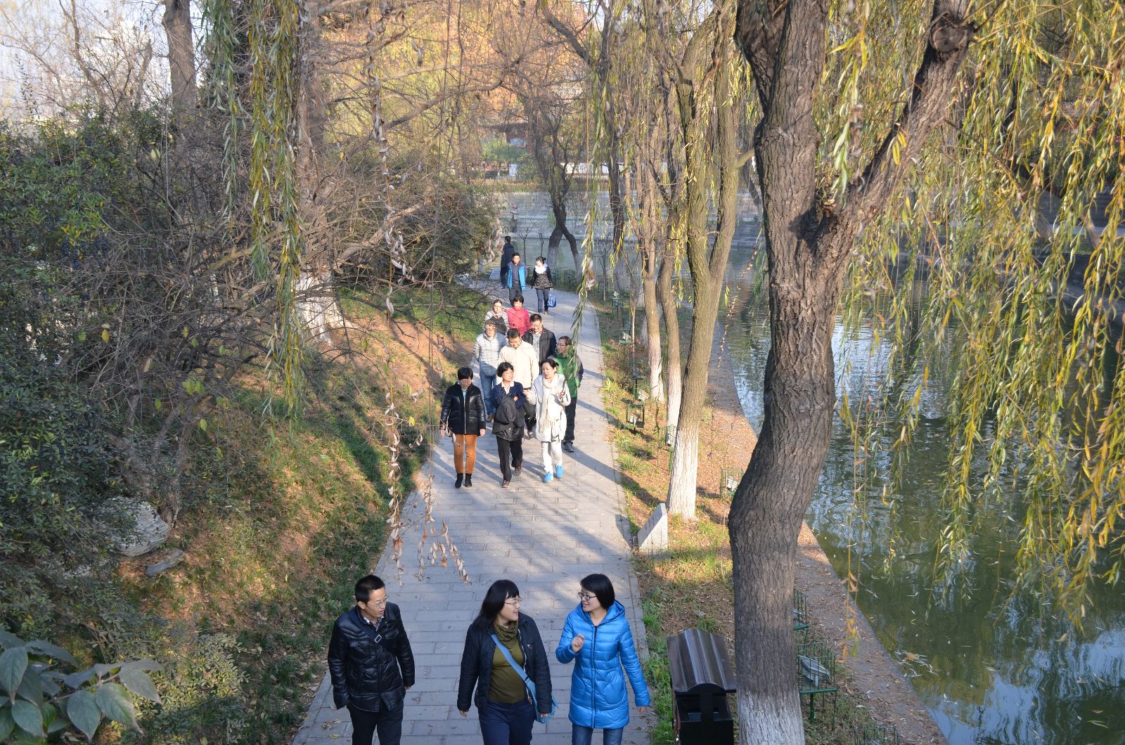 第一期健身活动——“兴庆湖畔健步走”正式开始。来自学院各个系的三十多位教工身穿运动衣,脚蹬轻便鞋,昂首阔步,沿着兴庆湖畔快步行进。健步队伍当中有知名的老教授,也有新加盟的青年教师。在焦垣生教授的带领下,大家沿着兴庆湖畔边走边聊,队伍里不时传出欢快的笑声;有的在健步途中,摆个造型,留下倩影;有的边走边沉浸在“片片枫叶情,浓浓秋冬意”的美好意境中。健步走环湖两圈,总长5公里,一个小时走下来,教工们面色红润,微微出汗。凡是参加活动的老师都获得了一份温馨的礼物,突出了健身活动的参与意识。