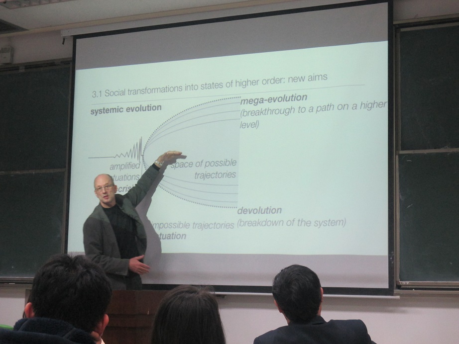 Wolfgang Hofkirchner院士在来校当日,即4月5日晚,便在创源论坛为大家奉献了一场名为“全球挑战时代的复杂性思维”的讲座。他首先从对全球面临的复杂性挑战和机遇的分析入手,提出解决全球复杂性问题需要复杂性的解决方式,以及相适应的复杂性思维。进而在系统主义理论的基础上拓展出对批判性社会系统理论的阐述,其构成包括了“社会转型为更高级的状态”的新目标、“社会自组织”的新视野和“理性的原则”的新方法三个方面的内容。三个方面层层递进,理论性强,所涉及的内容极具科学性和前瞻性,带给在场师生丰富、深刻的启迪和思考。