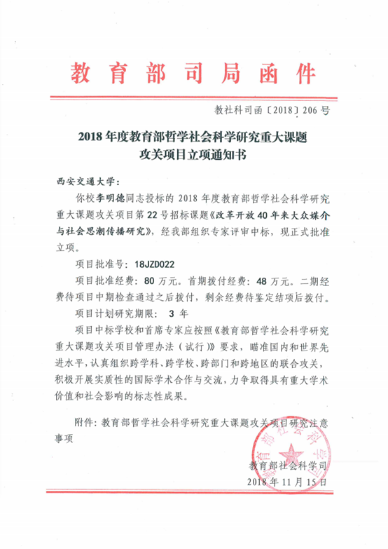 我本人这些年来一直把获得国家重大或者教育部重大作为追求的目标。特别是国家重大,这几年几乎每年都积极申报,希望获得成功,但竞争非常激烈。申报过程其实是对以往科研工作的总结、对科研能力的锻炼和提升、对未来研究方向的凝练。今年获得教育部的重大项目,应该说是最近这几年在舆论导向、社会思潮、意识形态传播方向研究成果的结晶。