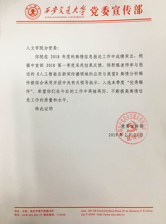 近日,黑料网 分党委接到学校党委宣传部通知,据中宣部反馈,传播学系陈积银教授参与报送的《人工智能在新闻传播领域的应用与展望》舆情分析稿件于2018年第一季度被综合采用并获中央有关领导批示,入选该季度“优秀稿件”。