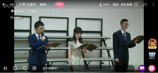 师生原创的“疫情”歌曲也出现在这次音乐会上,抒情的旋律回荡在音乐会现场,通过在线直播将正能量传递给更多的人们。节目接近尾声,曹耿献副教授创作的诗歌《东来西去》,用优美的语言诠释一群走出东部繁华的西迁人,扎根西部,最终在这里实现了人生价值。音乐会的最后同学们唱起了《同桌的你》和《我们年轻人》,将整个音乐会推向了高潮。
