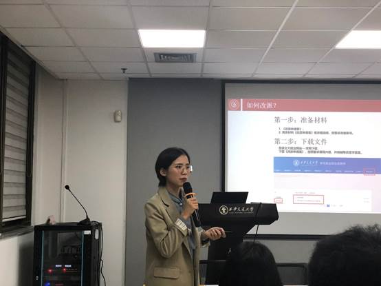 闫老师针对就业签约的基本流程和细节问题为同学们进行讲解。闫老师就上一届学生的就业情况作了汇报,随后就签约流程、解除就业协议、如何改派、开具证明材料、档案、报到证、党团关系等七个问题为同学们进行了详细讲述,并就同学们提出的问题进行解答。