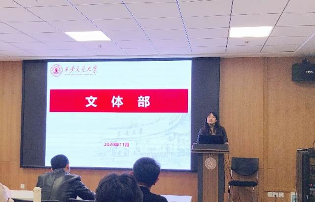 文体部负责人雷恺祺简要介绍了文体部的职能,以及近期承担的各项活动,并介绍了来自不同专业的五位成员,希望在接下来的一年中,通过新的部门管理模式——自主选择、项目化管理,来举办各式各样丰富多彩的文娱活动,激发同学们的参与热情,在学术研究和文体活动两不误的状态下快乐生活。