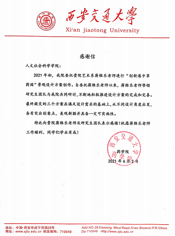 艺术系蒋维乐老师进行“创新港中草药园”景观设计方案创作。信中对蒋维乐老师及带领的研究生团队对于“创新港中草药园”景观设计顺利完成方案的努力表示感谢。
