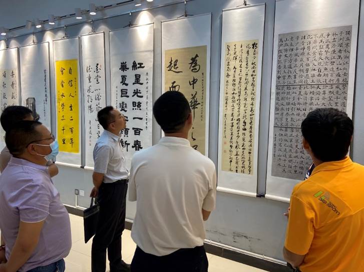 随后,王劲、辛敏行与当地文联、书协负责人参观了施甸县“奋斗百年路、启航新征程”庆祝中国共产党成立100周年书画摄影作品展。在观展过程中,王劲对当地书法事业的发展提出了建议,对书法家如何参与全国书法展赛提出了建设性意见,并于参观展览后与当地书画家进行了笔会交流。