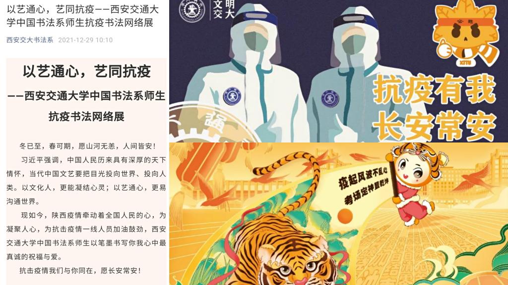 作为承担学校文化建设重点任务的单位,以文艺创作为抗疫加油是重大的政治责任。音乐教育中心教师联合校内师生隔空创作表演歌组曲:《爱的奉献》《长安永安宁》《光·明》,用歌声表达了对抗疫一线工作人员的敬意,对全市人民齐心抗疫的心声,和对这座千年古城的祝福,作品在各大网络平台发布后点击量快速突破30多万次。中国书法系举办“以艺通心,艺同抗疫”书法作品网络展,引导师生创作书法作品,以文化人,以艺通心,助力抗疫。艺术系教师通过引导学生创作海报、抗疫头像、日常空间再设计等方式,配合学校做好疫情期间的宣传与设计工作,传递抗疫暖心正能量。社会心理学研究所王瑜萍副教授撰写抗击疫情科普小贴士,引导师生服务大局,科学防疫。黑料网