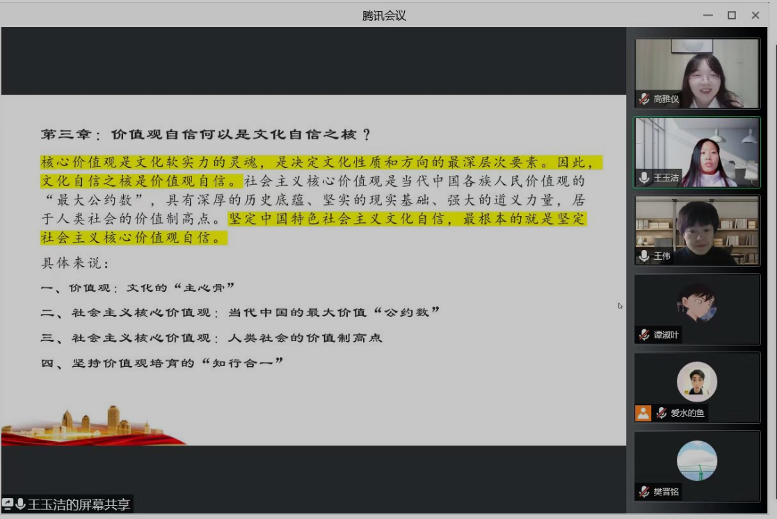 王玉洁从第三四章的价值观自信何以是文化自信之核以及如何“不忘本来”,传承基因进行分享。指出文化自信之核是价值观自信,文化在传承中创新,在创新中发展,在发展中得以延绵不绝、生生不息。在深刻把握中华优秀传统文化精义的基础上,积极推动其实现创造性转化和创新性发展,发扬红色传统、传承红色基因是增进当代中国文化自信的内在要求。