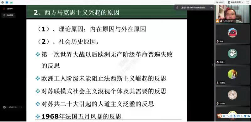 哲学系王健副教授以饱满的热情和翔实的资料向同学们讲述西方马克思主义的相关知识。同学们在课上运用聊天框和语音消息的方式,与王老师积极互动。在整堂课的过程中,哲学91班延续了往日线下课的传统,在课上展现了乐观踊跃的精神风貌,即便是疫情,也无法阻挡学生们的学习劲头。