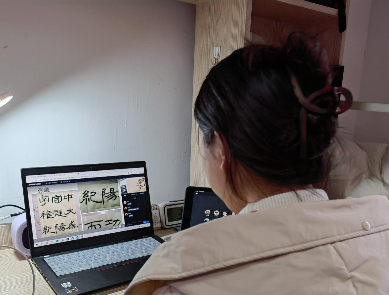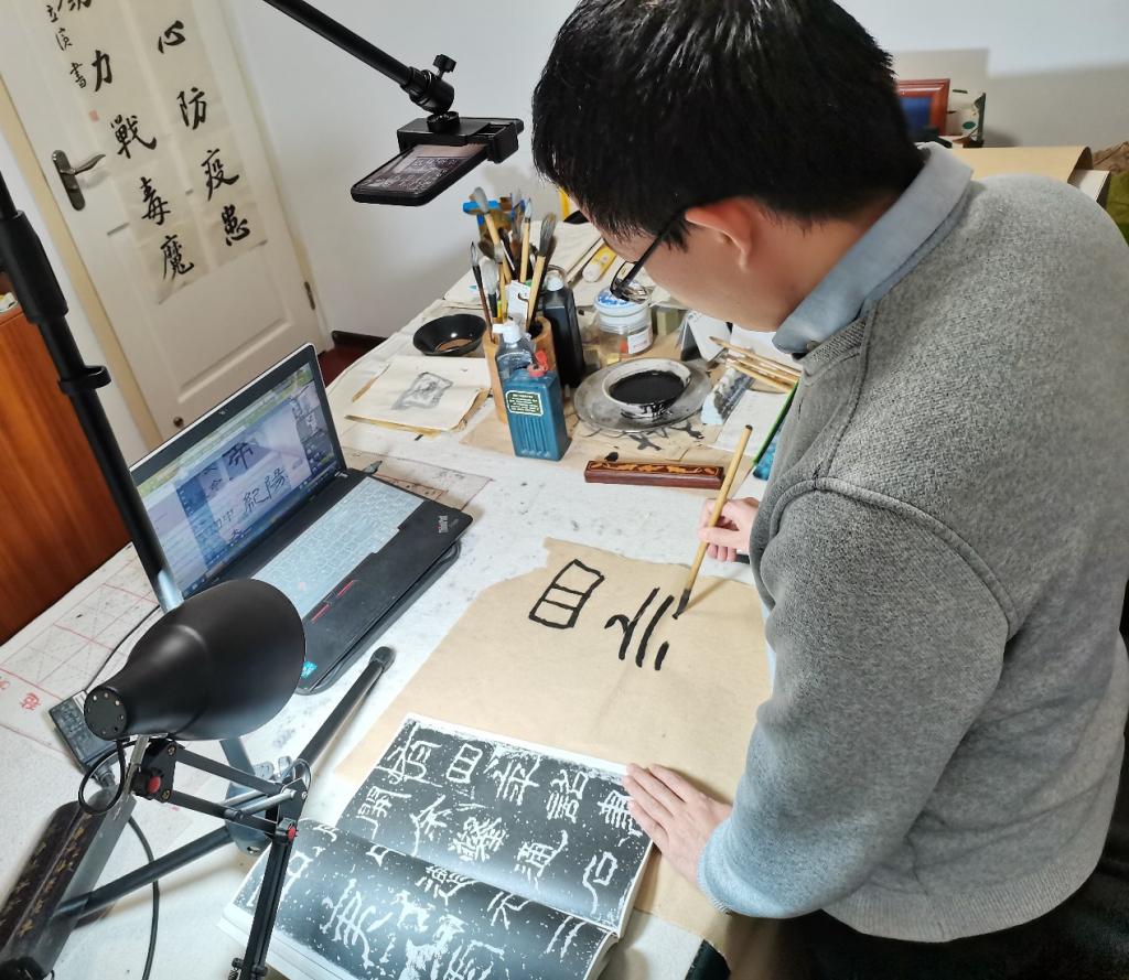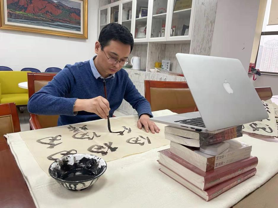 书法系王劲副教授作为驻守兴庆校区唯一的副书记,在管控政策执行以来,一直住在兴庆校区宿舍中没有回家,春季课程周开始后,王劲老师在会议室直播授课。因书法专业教学多偏实践性,书法系孙立滨老师提前准备了各种书法写作设备,保证了同学们上课的效果。