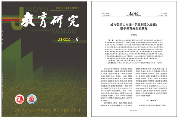 社会学系李晓光助理教授完成的研究《城市劳动力市场中的性别收入差距:基于教育失配的解释》于《教育研究》2022年第6期发表。