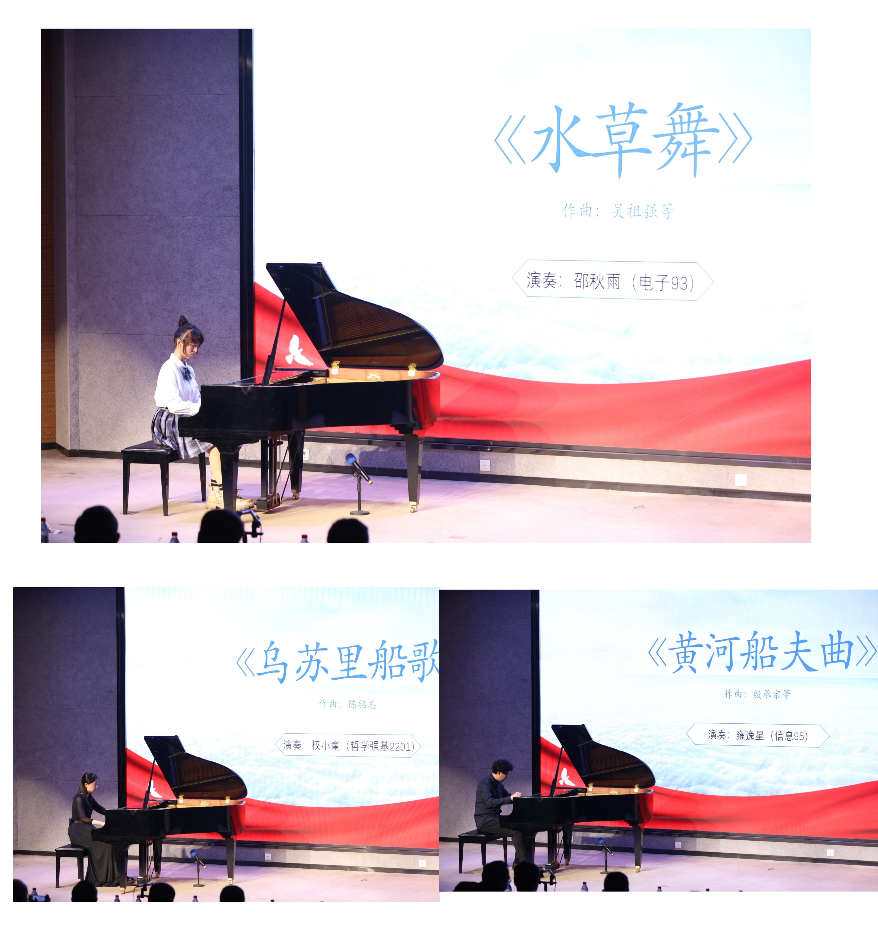 《水草舞》(演奏者:邵秋雨,电子93)《乌苏里船歌》(演奏者:权小童,哲学强基2201)和《黄河船夫曲》(演奏者:雍逸星,信息95)均为第二阶段优秀作品的代表,多样的风格和脍炙人口的韵律使现场听众深深陶醉。在这段时期,中国钢琴音乐无论在质量上还是数量上都得到空前发展。
