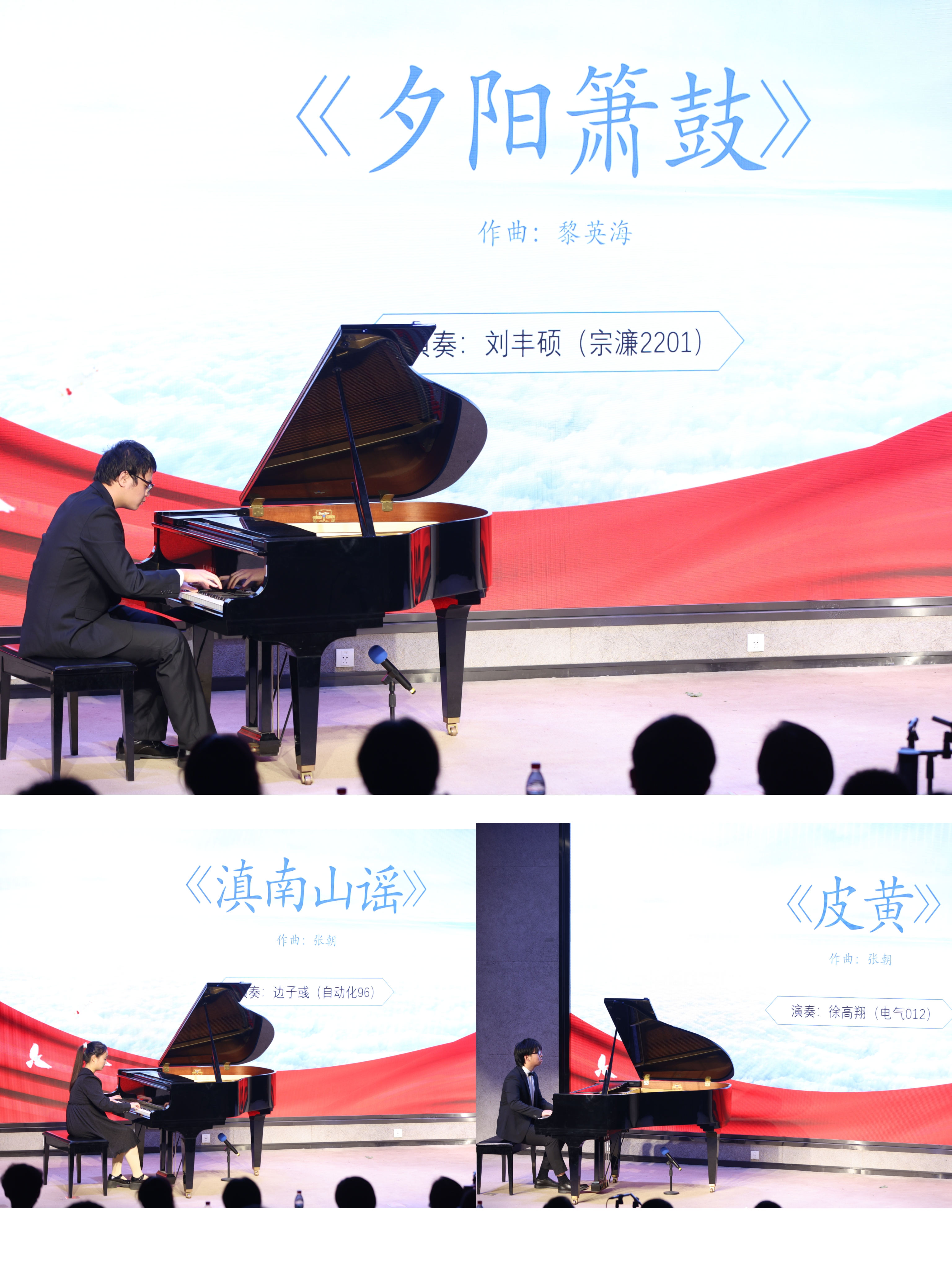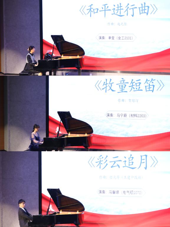 第一阶段音乐会选取了中国作曲家创作的第一首钢琴曲《和平进行曲》(演奏者:单莹,金工2101)、具有里程碑意义的《牧童短笛》(演奏者:马宁蔚,材料2203))以及早期创作的民族风格浓郁的《彩云追月》(演奏者:冯馨缘,电气硕1070)作为代表作品。