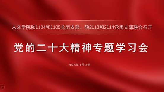 硕1104和1105党团支部、硕2113和2114党团支部联合开展党的二十大精神专题学习会。本次专题学习会共有五十余名同志参加,硕1104和1105党支部组织委员兼团支部书记王华担任主持。