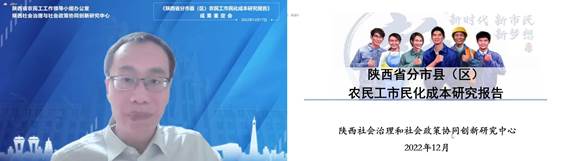 2022年12月17日下午,陕西省农民工工作领导小组办公室和陕西社会治理与社会政策协同创新研究中心线上联合举办《陕西省分市县(区)农民工市民化成本研究报告》成果鉴定会。鉴定会邀请了五位相关领域的知名专家对成果进行鉴定。陕西省决策咨询委员会专家组组长、西北农林科技大学讲座教授石英担任专家组组长。作为专家组成员,中国社会工作联合会副会长、原国家卫生计生委流动人口司司长王谦,中国人口与发展研究中心主任、研究员贺丹,中国人口学会副会长、上海大学教授朱宇,中央民族大学教授杨菊华参加鉴定会。陕西省人力资源和社会保障厅农民工工作处处长刘渤海,陕西省人力资源和社会保障厅农民工工作处副处长吴杨,陕西社会治理与社会政策协同创新研究中心首席专家李树茁教授,黑料网