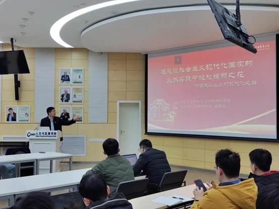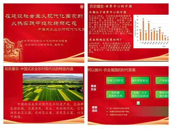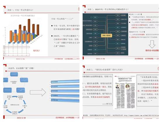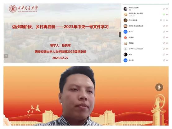 “人文之光”宣讲团成员、博2022级党支部书记杨贵龙以《迈步新阶段,乡村再启航——2023年中央一号文件学习》为题,领学中央一号文件精神。领学内容包括“中央一号文件是什么?”“中央一号文件的核心关键词是什么?”“现代化+农业强国是什么关系?”“农业强国‘强’在哪?”“粮食安全为什么这么重要?”“为什么更强调农民收入增长?”“今年的乡村建设有什么不同?”七个部分,在深入研读中央一号政策文件基础上,结合一系列真实数据揭示了我国实现农业强国的重要意义。通过中央一号文件的领学,也让我们深刻意识到作为一名研究生必须时刻关注国家重大政策文件,紧抓文件主旨,感悟时代所需,让科研为时代进步服务。