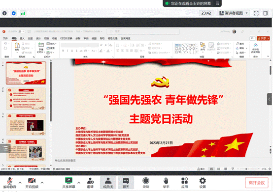 博2022级党、团支部与中国农业大学土地科学与技术学院土地管理系博士党支部、人文与发展学院公共管理硕士党支部、土地科学与技术学院土地管理系硕士党支部共聚云端,联合主办“强国先强农,青年做先锋”主题党日活动。会议由中国农业大学土地科学与技术学院土地管理系博士党支部书记金玉铃主持,两校6个研究生党支部、近200余人分别通过线上或线下形式参加会议。