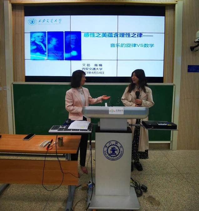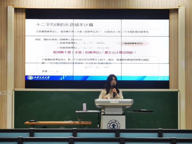 音乐教育中心文茹老师和前沿院艺术科学与表达交流中心南楠老师联合主讲,主题为“感性之美蕴含理性之律——音乐的旋律VS数学”。本次课程将音乐与数学两个学科进行交叉融合,以美育之感性合数学之理性,引导学生在音乐中体会其中蕴含的数学规律之美,带领学生体悟真与美的密切联系。