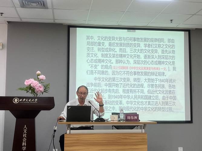 周教授首先从中华文化的特性出发,谈到中华文化是中华民族共同体的根和魂,它是“多元一体”,“合而不同”的,其基本特点及发展规律与任何事物一样,那就是文化的变异性和稳定性,有具体不同内涵、特点和规律。随后他从要重视保护、可持续开发利用、发展创新这三个方面具体分析了要如何构建现代中华文化,铸牢中华民族的根基。最后他总结到加强对中华文化的认同对我们构建和弘扬中华一体文化具有十分重要的深远的意义。