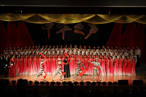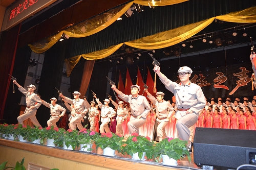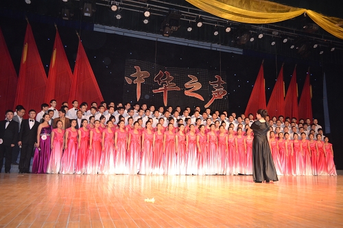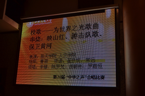 和航天学院联队于第六个上场,表演了校歌和歌曲串烧映山红、游击队之歌、黄河大合唱,深刻展现了中华人民在抗战历史时期浴血奋斗,甘于奉献的伟大精神。校歌《为世界之光》,庄严肃穆中又不乏青春活泼;《映山红》,悠扬坚定,满怀希冀;《游击队之歌》,低声浑厚有力,高声慷慨激昂;最后,在大家的一致配合下,唱起了《黄河大合唱》,情绪喷薄而出,气势恢宏,似有万马奔腾。指挥曹鹏激情洋溢,专业且不失优雅。领唱歌声婉转,领诵铿将有力。整场表演情绪收放自如,热情昂扬,浑厚悠扬的歌声和丰富多彩的表演形式生动而恢弘地展开了一副盼得红军迎解放的弘美画卷,深切表达了对祖国、对党和学校的至深感情和无比热爱。别出心裁的创意,意气风发的表演,让大家既感受到了人文学子的热情、活力,又为党的十八大献上一曲赞歌。经过综合评比,最终以100.32分位列第五名。
